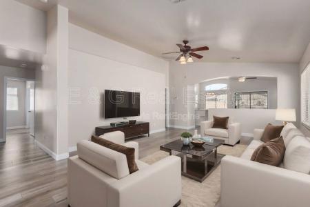 Welcome to this stunning 3-bedroom single-family home, perfectly located in the heart of Goodyear. Enjoy a spacious open floorplan filled with natural light, updated flooring and neutral tones that complement any... style. The bright, all-white kitchen offers seamless sight lines into the family room, dining area and backyard-ideal for entertaining. The dedicated office space is the perfect flex space as you can use it as a formal dining room, children's play room - the possibilities are endless. Each bedroom is generously sized, providing comfort and flexibility. Step outside to your private oasis featuring a sparkling pool and built-in BBQ-with pool service included perfect for relaxing or hosting all summer long. Rent - $2,045 + $50 tenant care fee. Refundable Security Deposit - $1,612.40. Nonrefundable Cleaning Fee - $311.60. ReKey Fee - $121. Application Fee - $50. Admin Fee - $150. David Pickett. (623)887-3505. E & G Real Estate Services. Pet Friendly, Pool, Dining Room, Family Room & Office. Listing provided by RentalSource. Read more