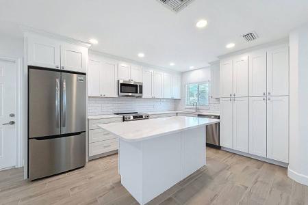 Sunny, cheerful and solidly built, this beautifully remodeled waterfront home in Redington Shores offers the perfect blend of coastal charm and modern comfort. From the moment you arrive, you'll notice the... modern look and feel of the exterior and the expansive circular paver driveway, which provides ample off-street parking for you and your guests. Inside, the thoughtfully redesigned interior features an open floor plan, with water views from both the great room and the primary suite. The stunning kitchen has been completely remodeled with new white shaker cabinetry, quartz countertops, a spacious island with seating for six and all-new appliances, offering plenty of counter space and cabinet storage. At the rear of the home, the spacious primary retreat boasts double closets and a beautifully remodeled private bath with a large spa-like shower and new double vanity. The generous front bedroom - perfect as a second primary suite - includes a remodeled ensuite bath that also functions as a convenient guest bath with access to the living area. French doors from the living room open to your private tropical oasis, where an expansive composite deck leads to a beautiful white stone paver patio at the water's edge. At low tide, enjoy access to a small sandy beach area, with 40 feet of waterfront for easy launching of kayaks, paddleboards and other water toys. Privacy is enhanced by a vinyl fence and lush landscaping with mature palms and decorative plantings. Additional upgrades include impact windows and doors, fresh interior and exterior paint, updated lighting and new wood-look tile flooring throughout. The one-car garage provides storage for beach gear as well as parking for a vehicle or golf cart. Located just a block from a charming neighborhood park and a short walk to the sugar-white sands of the Gulf of Mexico, this home offers an exceptional beach lifestyle. Local shopping and multiple dining options are just a short bike or golf cart ride away. Rent $3,500 per month. Move in requires $3,500 security and 1st month's rent with approved application(s); Application fee is $65 per adult occupant; Rent includes: Grounds Care, Tenant is responsible for electric, cable/internet, water/sewer/trash. Pets considered (no cats); Small dogs less than 35lb, 2 pets max; breed restrictions apply; $500 deposit & $50 monthly rent per pet; Available Now. Small Dogs Allowed, Large Dogs Allowed, H O O K U P S, Deck, Fenced Yard, Playground, Dishwasher, Garbage Disposal, Microwave, Refrigerator, Ceiling Fan, Patio, Window Coverings, Family Room, Master Bath, Tile & Central. Listing provided by RentalSource. Read more