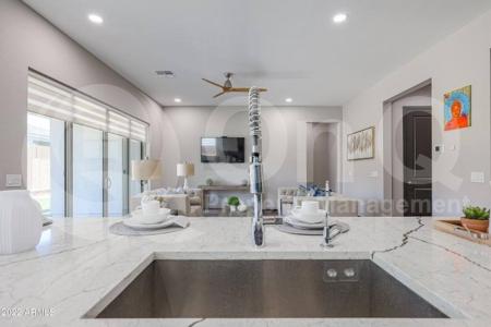 Available Now. 2,322 Sq Ft. 3 bedroom, 2.5 bath home in Sky Crossing. Desirable single story floor plan with modern upgrades + smart home features throughout. Stunning eat-in kitchen with stainless steel appliances,... expansive center island/breakfast bar and walk-in pantry. Kitchen opens to a spacious living/dining area, great for entertaining. Sliding door patio access. Neutral interior with tile and carpet flooring in all the right places. Split bedroom floor plan offers 3 nicely sized bedrooms + flexible den space. Den makes a great home office/bonus room. Primary suite with full bath + walk-in closet. Secondary bedrooms each with optimal privacy. Blinds+ceiling fans. Laundry room with included washer/dryer. Enjoy a low up keep backyard with a covered patio, turf and extended pavers. 2 car garage with Ev charger available. Astarea at Sky Crossing is a desirable gated community offering community pool + spa, playgrounds, sports courts, workout facility and biking/walking trails. Great Phoenix location with easy AZ-101 access. Pet Policy: Dogs and Cats Allowed with the following exceptions: Pets will be considered upon approval. Application: $65 Application Fee Per Applicant 18 years or older (Nonrefundable). Once all required documents have been submitted by every applicant, please allow 24-72 business hours for processing. Move-in dates more than 21 days after application approval require additional approval. Lease Length: 12-month minimum (longer lease terms may be negotiable) Initial Move-In Costs: Applicants may choose between a traditional security deposit or a Security Deposit Alternative program. A one-time lease preparation fee of $250 plus the first month's rent is due prior to move-in. If the applicant has a pet, a $150 nonrefundable pet fee per pet applies. Recurring Monthly Costs: A 4.99% administration fee applies. All on Q Property Management residents are enrolled in the Resident Benefits Package for $49. This package includes liability insurance, credit building to help boost your credit score with timely rent payments, a move-in concierge to make utility connection and home service setup simple, a Renter to Buyer program and more. All information, including advertised rent and other charges, is deemed reliable but not guaranteed and is subject to change. Pet Friendly, Concierge, Fenced Yard, Fitness Center, Playground, Pool, Sports Court, Dishwasher, Washer, Dryer, Microwave, Refrigerator, Ceiling Fan, Patio, Family Room, Laundry Room, Office, Pantry, Carpet & Tile. Listing provided by RentalSource.