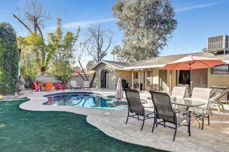 This home is on a quiet dead-end street with little traffic and views of Camelback to the north from the front porch. Comfortable and bright with large sectional in living area plus dining for 6. North/south... exposure affords lots of natural light inside and out. Backyard is resort-like with fabulous tree-house, pool, fire pit, tiki bar, TV and very private. Primary suite has been remodeled and is spacious with over-sized shower. Obedient dogs are allowed (one) up to 20 lbs. Off street parking. Only Available For May To November 2026. Dishwasher, Disposal, Freezer, Gas Stove, Granite Countertops, Microwave, Oven, Refrigerator, Ceramic Tile, First Floor Suite, Guest Suite, Laundry Room, Living Room, Office, Primary Bath, Primary Bedroom, Air Conditioning, Cable / Satellite, Ceiling Fan, Dryer, Furnished, Garage, Jetted Tub, Shutters, Storage, Washer, Fence, Garden, Hot Tub or Spa, Landscaping, Lawn, Patio, Pool Service, Porch, Sprinkler System, Swimming Pool & Pet Friendly. Listing provided by RentalSource. Read more