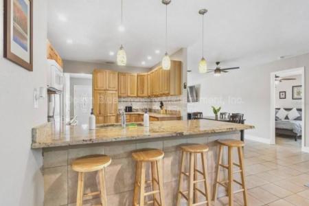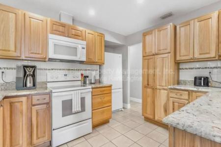 Newly remodeled through out, including a beautiful new kitchen with granite countertops and top of the line cabinetry. Open floor concept with a large family room and dining room. The home offers huge windows to... allow natural sunlight stream in Enjoy the cozy wood burning fireplace and large breakfast counter top, stools included. The primary bedroom is roomy enough for king size furniture with a large walk in closet and full bathroom. The second bedroom is situated on opposite side of home offering privacy. The second hall bathroom offers a cool and remodeled step in shower. Check out the walk- in laundry room with a additional shower, soaking tub and front load washer and dryer included. Leading from the kitchen, you can step outside to an oversize screened in lanai, including pull down sun guard windows. The Fully fenced back yard offers lots of palms trees for shade and and a shed for your use. Set an appointment today for a showing. Pet Friendly, Dishwasher, Washer, Dryer, Freezer, Garbage Disposal, Microwave, Range Oven, Refrigerator, Fireplace, Ceiling Fan, Double Pane Windows, Large Closets, Patio, Storage Space, Dining Room, Family Room, Laundry Room & Walk In Closet. Listing provided by RentalSource. Read more