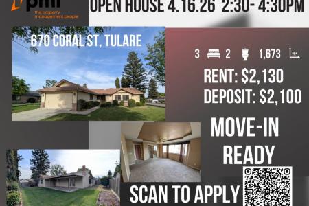 Open House 4.16.26 2:30pm - 4:30pm. Inspired by the tranquility of California living, 670 Coral St in Tulare is a stunning sanctuary perfect for those seeking comfort and style. This 1,673 sq ft home invites you... into a spacious and welcoming atmosphere with three beautifully appointed bedrooms, providing ample space for relaxation or productivity. The two full baths are designed with modern finishes, ensuring you start and end your day with a touch of luxury. The open floor plan effortlessly connects the living, dining and kitchen areas, making it ideal for entertaining or enjoying quiet family moments. Large windows fill each room with natural light, creating a warm and inviting ambiance throughout the home. The kitchen serves as the heart of the home, ready to inspire your culinary adventures. This well-maintained property also offers plenty of storage solutions to keep your living space organized and clutter-free. Nestled in a friendly neighborhood, you'll enjoy the perfect blend of community and privacy. Located in Tulare, you're just moments away from local amenities, parks and schools, making 670 Coral St a prime location for convenience and accessibility. Experience the charm and comfort of this exceptional rental property and make it your next home sweet home. Garden, Landscaping, Lawn, Patio, Dishwasher, Electric Stove, Microwave, Carpet, Ceramic Tile, Air Conditioning, Blinds, Garage, Vaulted Ceilings, Washer Dryer Hookups & Pet Friendly. Listing provided by RentalSource. Read more