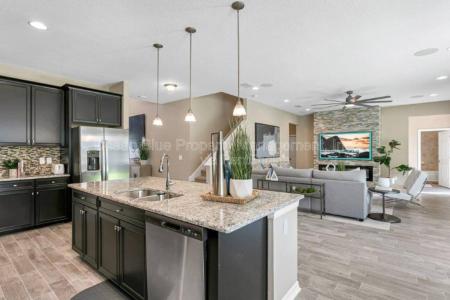 A Beautifully Furnished 5 bedroom 3 bath gem with Utilities, Cable, Internet, Smart Mirror, Frame TVs, Lawn Maintenance & Cleaning Service All Included. Located on a quiet cul-de-sac, this gorgeous new build... home caters to those who value privacy that overlooks a wooded conservation area. The eloquent foyer and hallway welcomes you as you enter the open living room and modern gourmet kitchen with quartz countertops & extended cabinets. The living room is made for entertaining featuring a built-in fireplace, Surround Sound & 75' Samsung Frame T. V. Outdoor living made easy with the triple pocket sliding glass doors leading to the covered lanai and partially fenced backyard offering a view of the serene woodsy conservation. Perfect for family & friends gatherings. The En-Suite features trey ceilings with recessed lighting, tinted windows and a 65 Frame T. The En-Suite huge bathroom offers a double vanity sink, frameless walk-in shower and a large pyramid bathtub situated between two Tinted Windows for maximum privacy. The En-Suite Closet is Customized With Drawers, Shelves And Lighting. The three additional bedrooms, a spacious loft area and a third full bathroom complete the second floor. The Six Samsung Frame T. V.s mounted throughout the home welcomes you to customize the home, turning the T. screens into your own personal art showcase or family photo gallery. The Three Car Garage Comes Equipped With An Electric Car Charger, The Garage Transforms Into A Home Gym or Additional Lounge Area That Is Equipped With The Latest And Most Updated Smart Workout Mirror And A 50' Frame T. The Epperson Community Offers The Ultimate Florida Lifestyle, access to sandy beaches, cabanas, swim-up bar, live music and seasonal events. The Lagoon features endless aquatic activities. Centrally located, Epperson is close to The Grove Shopping Mall, Tampa's Premium Outlet Mall, Downtown Tampa, Tampa International Airport, Beautiful Clearwater & St Pete Beaches. Utilities, cable, internet, Lagoon Fee, lawn maintenance included, HOA fees and bi-monthly cleaning service included. Additional Furniture Deposit is required. Come to Epperson and live everyday like you're on vacation. Available Now. Lawn, Dishwasher, Washer, Dryer, Freezer, Garbage Disposal, Fireplace & Central. Listing provided by RentalSource. Read more